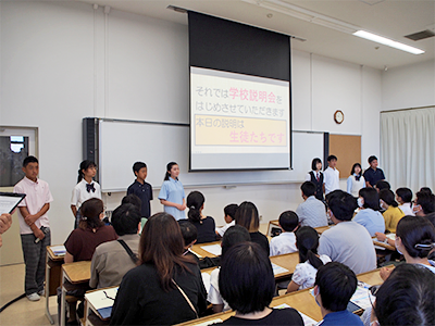 7月16日(日)、本校において「2023年度オープンキャンパス」を実施しました。 当日は晴天、熱中症対策をしながら、学校説明会はもちろん、クラブ体験・見学や体験イベントにもたくさんの方にご来場いただきました。体験イベントでは、参加体験型のイベントを中心に楽しんでいただきました。また、本校のPRに取り組む有志生徒「近和歌アンバサダー」による校内見学ツアーなど、生徒が中心となり行ったイベントもあり、夏の暑さに負けない熱気のあるオープンキャンパスとなりました。