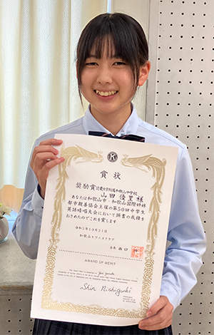 和歌山市内の中学校から選ばれた21名の中学生が発表し、本校中学2年生の山田優里さんが奨励賞を受賞しました。