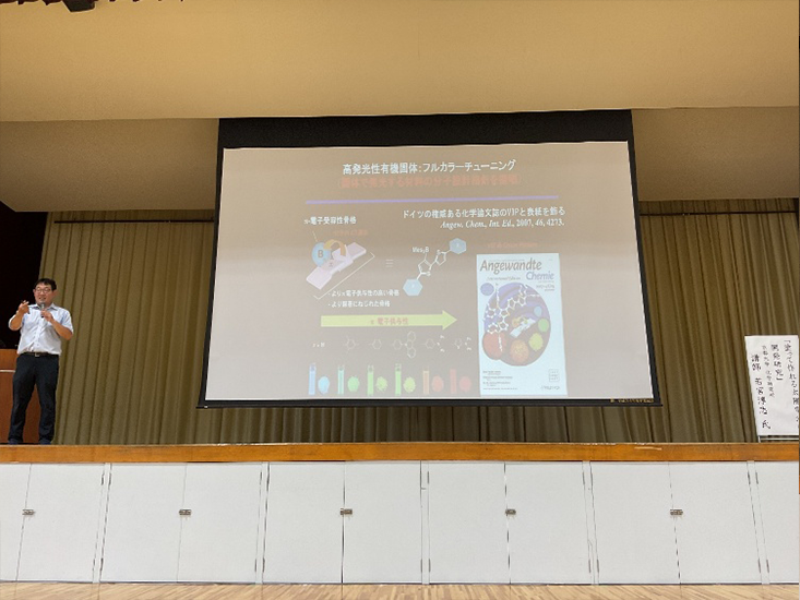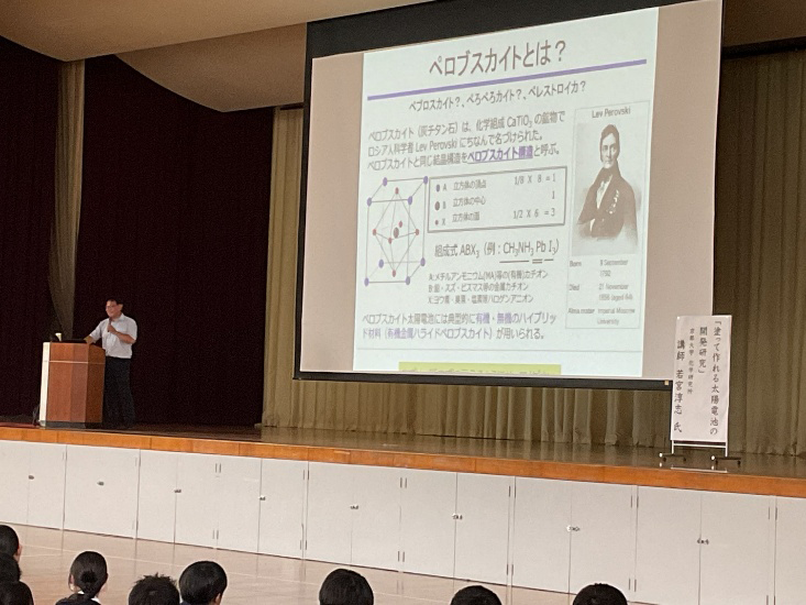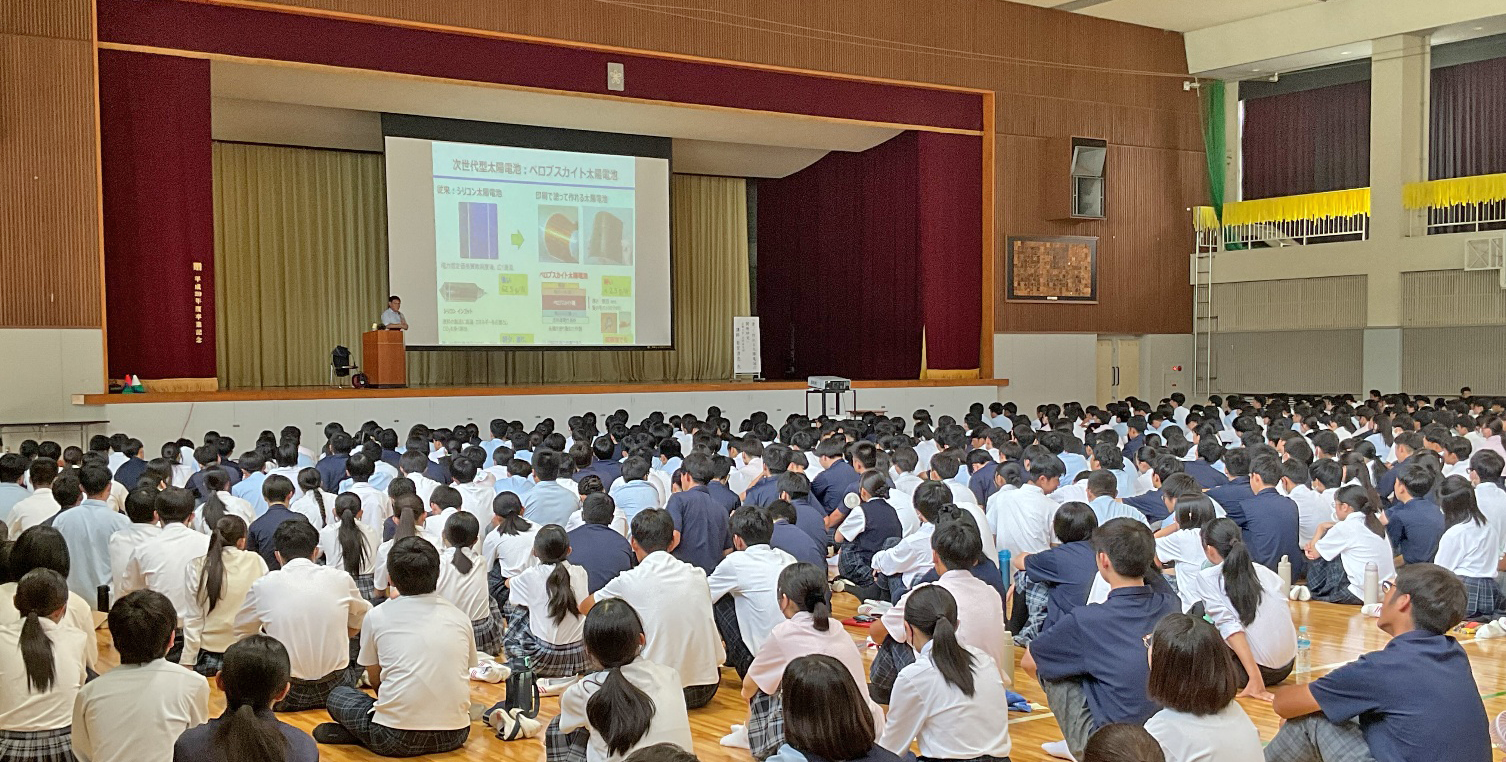 9月13日(土)、本校体育館において高校1・2年生を対象に「高校教養講座」を実施しました。今回は、京都大学化学研究所の若宮淳志教授を講師にお迎えし、「塗って作れる太陽電池の開発研究」という演題でご講演いただきました。講演では、次世代太陽電池として注目される「ペロブスカイト太陽電池」について、研究の最前線や実用化に向けた取り組みをわかりやすくご紹介いただき、生徒たちは熱心に耳を傾けていました。講演後には、実際の太陽電池に触れる機会もいただき、生徒にとって大きな感銘と刺激となりました。本講座を通じて、生徒たちは進路への意識を高めるとともに、持続可能な社会の実現を自らの課題として考える貴重な学びの機会となりました。