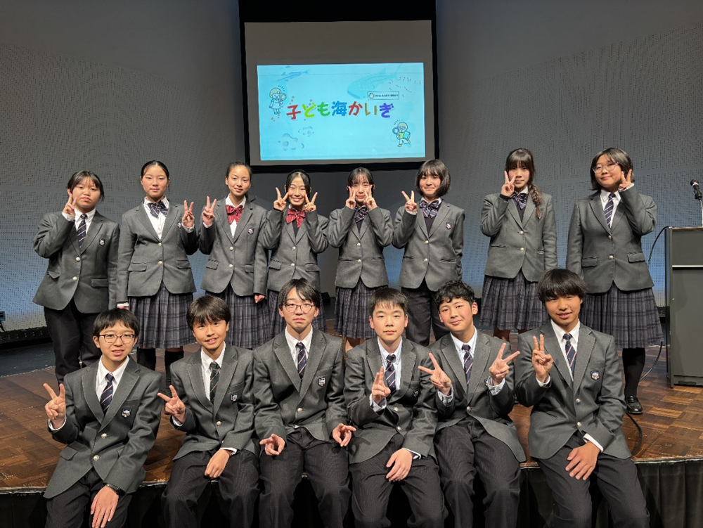 2月15日(日)、和歌山市内の小・中学校3校が参加して、和歌の浦アート・キューブ(和歌山市)で行われた「子ども海かいぎ 」に本校中学1年生が参加しました。1年生は、この発表会に向けて1年間様々な取り組みをしてきました。まず4月に和歌山市と「SDGsの推進に関する約束」を締結し、9月の文化祭では「守りたい和歌山の海」をテーマに、海や魚に関する研究発表と、自作の釣りゲームによって和歌山でとれる魚たちを参加者に知ってもらいました。そして、今回、さらにその研究を深め、「近大アイゴ養殖とSDGs」について発表しました。中学1年生の取り組みを知ってもらえるよい機会となりました。