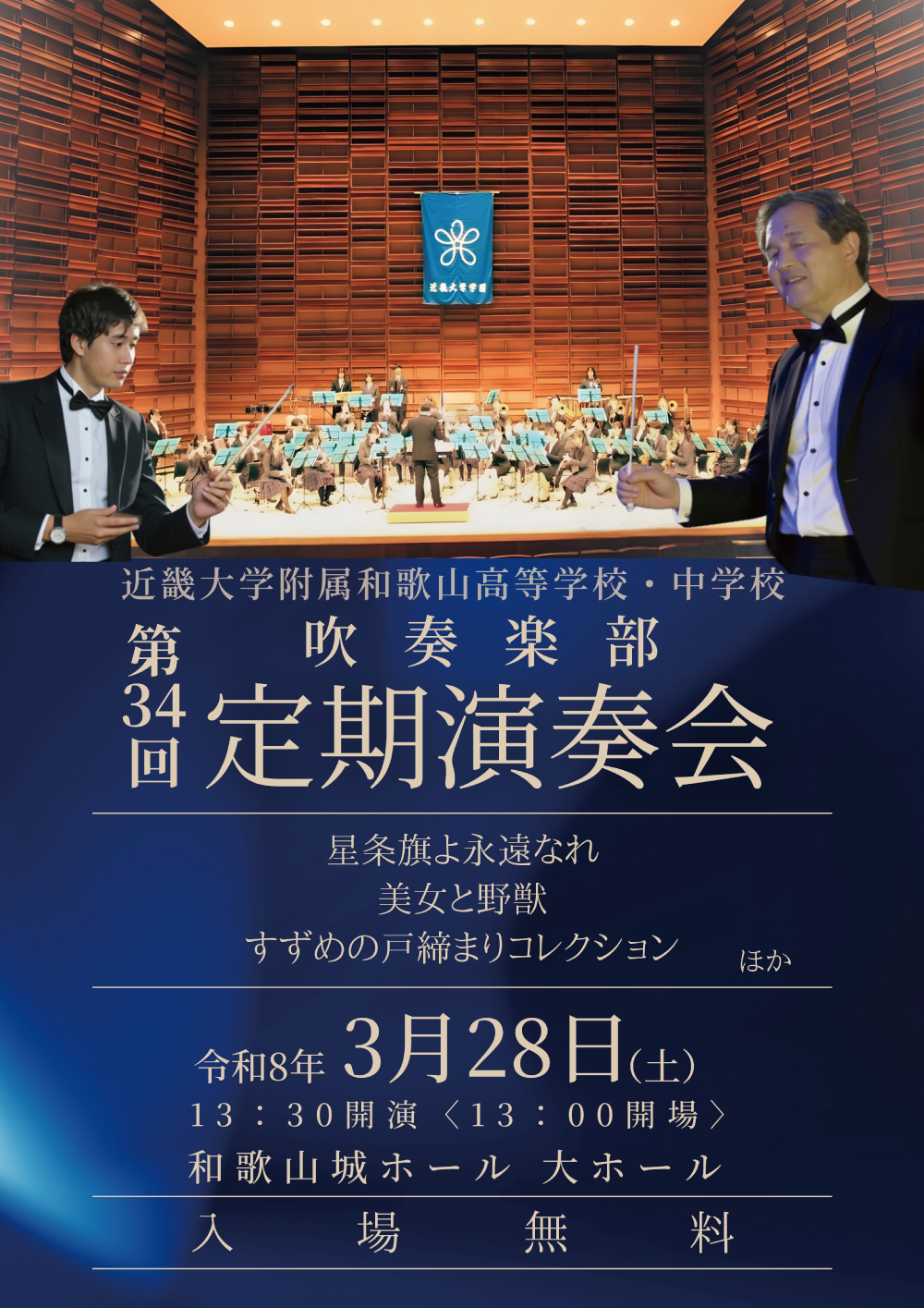 令和8年3月28日(土)和歌山城ホール(和歌山市)にて、今年で第34回となる『吹奏楽部定期演奏会』を開催します。今回のステージも楽曲演奏・ステージ演出ともに高校2年生の部員が中心となって作り上げ、OB・OGの先輩方も一緒に演奏します。皆さまに吹奏楽部の音楽を楽しんでいただけるよう準備しています。吹奏楽部員一同、精一杯演奏しますので、ぜひご来場ください。皆さまのご来場を心よりお待ちしております。